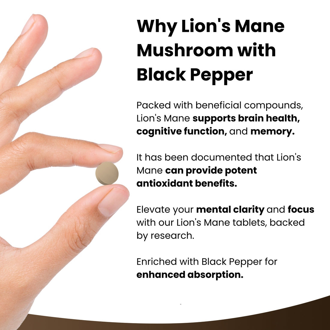 - Lion's Mane Mushroom with Black Pepper High Strength Supplement Tablets.