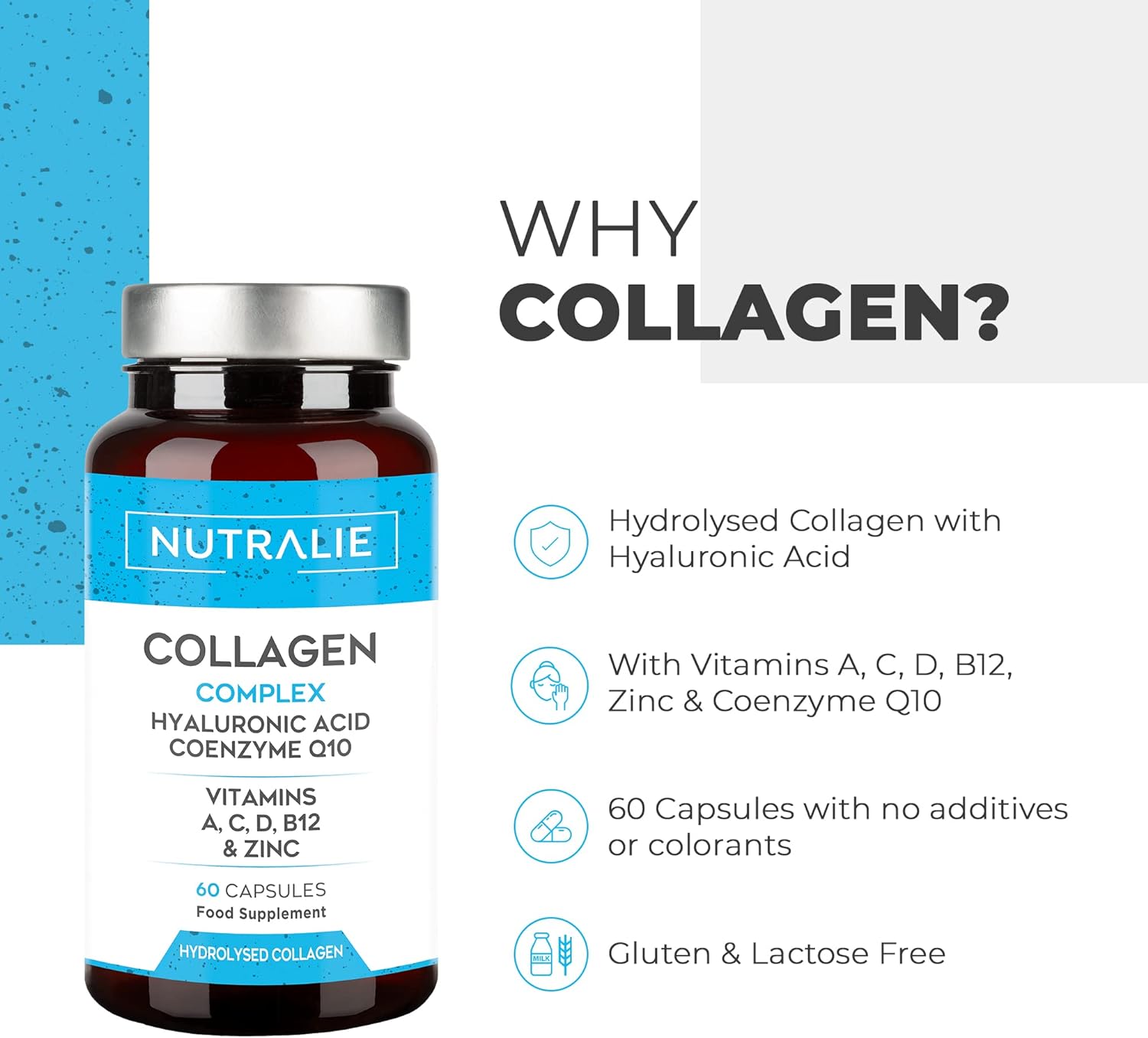 Collagen + Hyaluronic Acid + Coenzyme Q10 + Vitamins A, C, D and B12 + Zinc | for Skin, Joints and Hair | Hydrolysed Collagen 60 Capsules | Nutralie